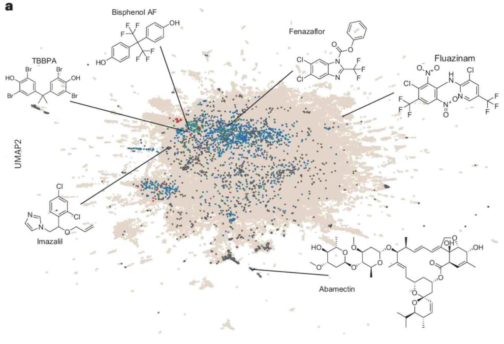 Invloed van 1076 veelgebruiktechemicaliën op  22n darmbacteriën (afb: Kiran Patl et al./Nature Microbiology)